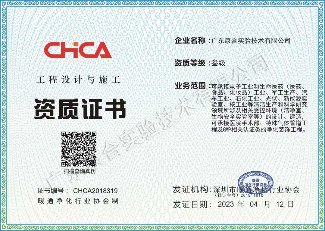 康合憑借雄厚的實驗室設計實力、規范的實驗室施工流程以及優良的服務質量,通過了ISO9001:2015質量管理體系、ISO14001:2015環境管理體系、BS OHSAS18001:2007職業健康安全管理體系等多項國際體系認證,擁有多項實驗室裝備行業的專利技術。